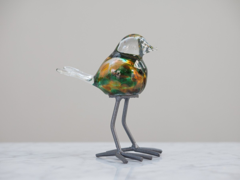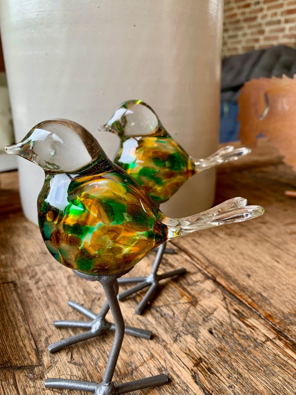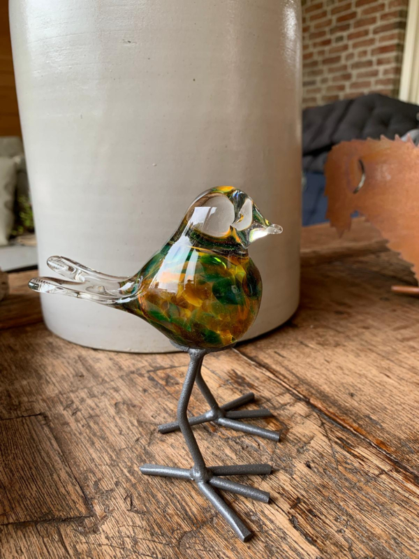 Glazen vogel in geel, groen, bruine tinten op stevige voet, hoogte 11 cm.