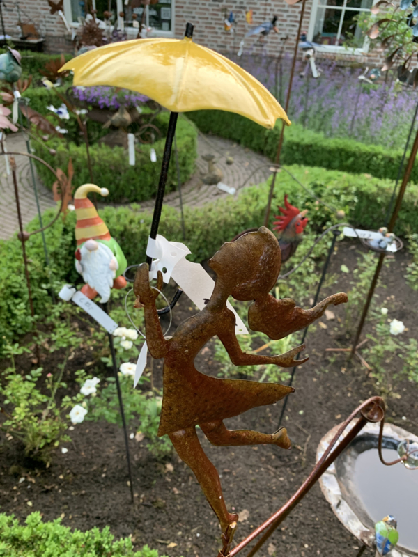 Een vrolijk metalen meisje met paraplu dat speels meebeweegt in de wind. Breng een glimlach en beweging in je tuin of op je balkon!
