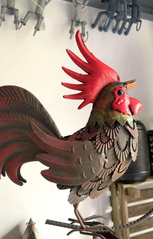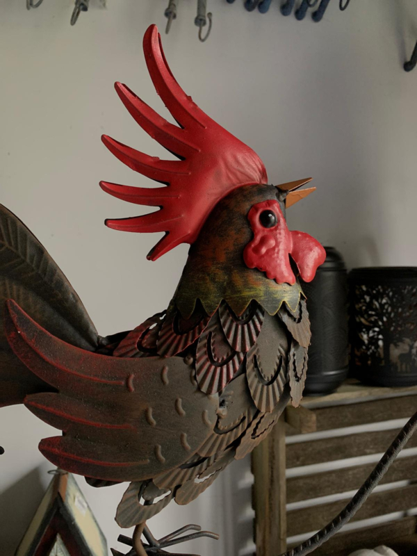 Deze prachtige metalen tuinsteker toont een trotse haan met zijn nest, die speels in balans beweegt. Een charmant en levendig kunstwerk dat je tuin een warme en rustieke sfeer geeft.