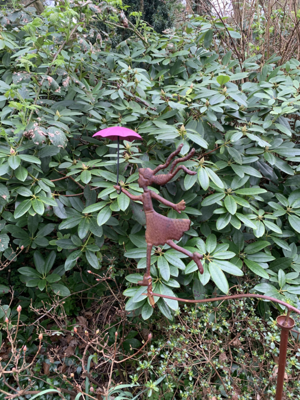 Een vrolijk metalen meisje met paraplu dat speels meebeweegt in de wind. Breng een glimlach en beweging in je tuin of op je balkon!