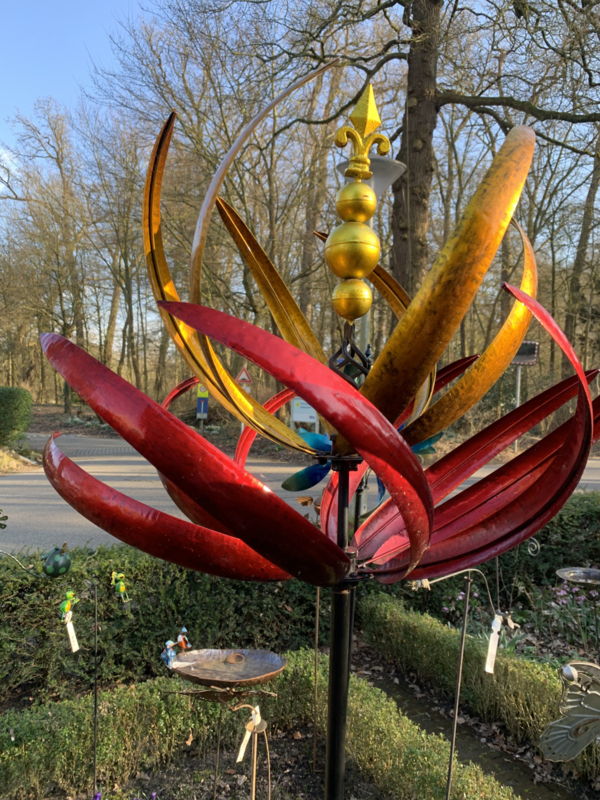 Windspel LotusOpvallende windmolen in goud/geel met rood, gemaakt van stevig metaal. Draait sierlijk mee met de wind en staat stabiel in elke border. Hoogte: 227 cm, diameter: 67,5 cm. Een echte blikvanger voor de tuin!